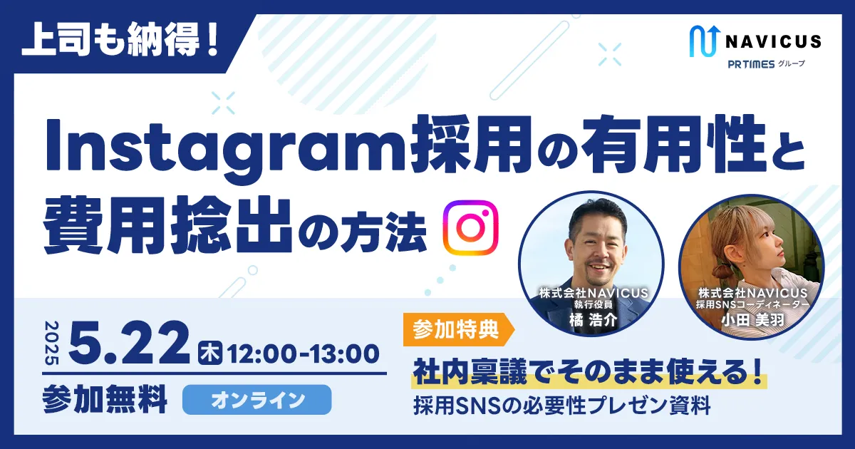 株式会社NAVICUSが提案する無料ウェビナー、「上司も納得!Instagram採用の有用性と費用捻出の方法」が2025年5月22日に開催されます。このウェビナーは、企業の採用活動の最前線で活用が期待されるSNS、とりわけInstagramに着目し、今後の採用戦略における有効な手法を模索するもので、特に採用広報や人事担当者を対象としています。