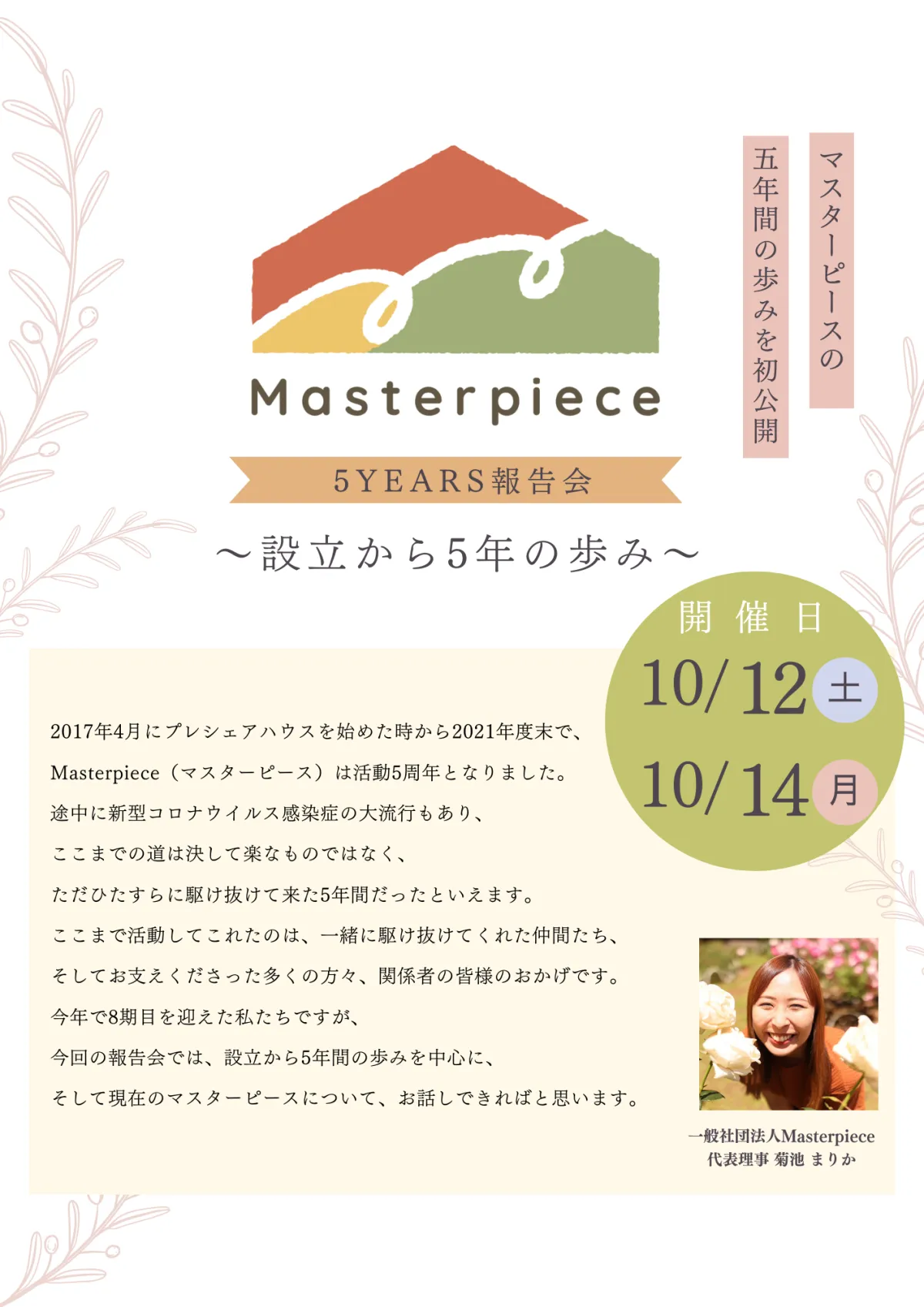 10月の特別な日、一般社団法人Masterpiece(東京都板橋区)は設立から5年の活動を振り返る報告会を開催します。若者たちの声を大切にするためのスピリットを持ったこの団体は、児童養護施設や里親家庭を巣立った若者たちなど、社会的に支援が必要な人々の生活基盤を支え続けてきました。