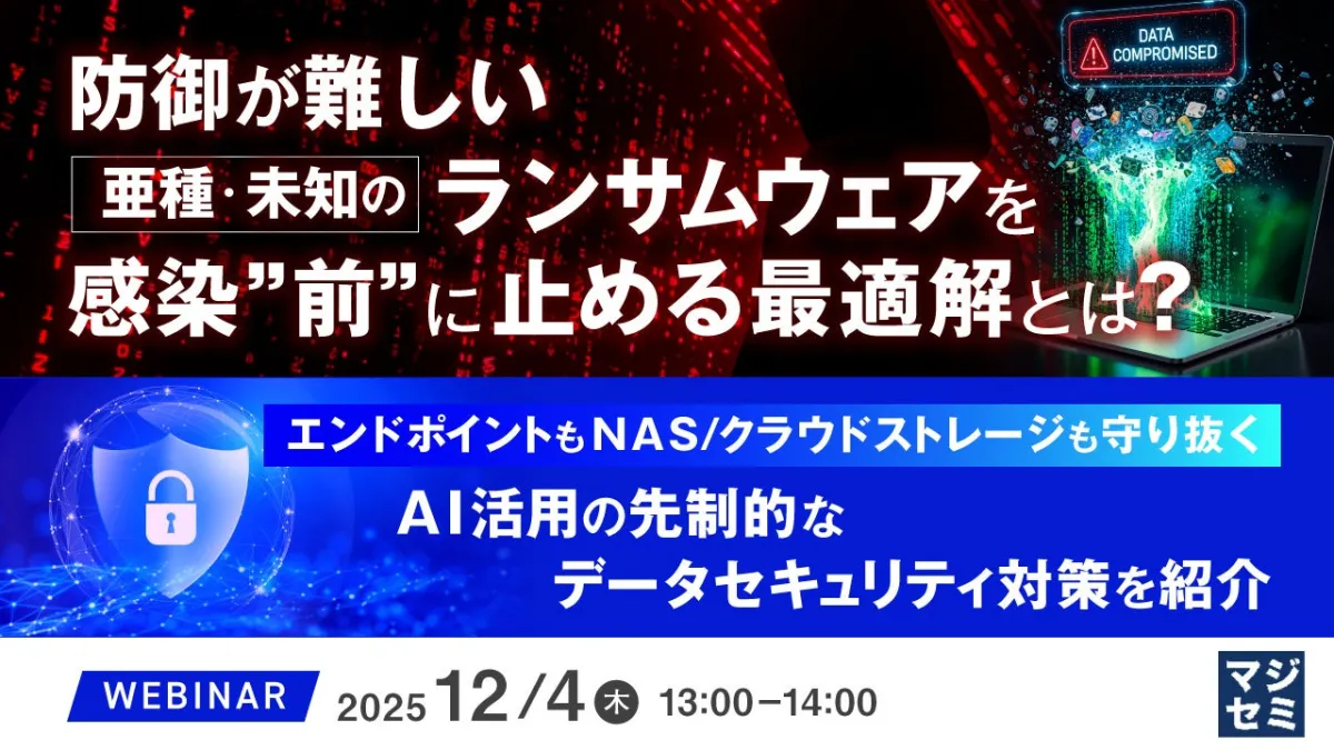 この度開催されるウェビナーでは、急速に進化するランサムウェア攻撃に焦点を当て、セキュリティの最新動向について詳しく解説します。「エンドポイント防御だけでは不十分」「脅威を検知してから対応しても遅い」という現場の課題に対して、NASやクラウドストレージも防御し、感染“前”に脅威を遮断する“先制的なデータセキュリティ”の重要性を紹介します。