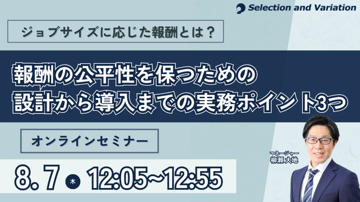 多くの企業では、報酬制度が過去の慣行を引き継ぎながら運用されていますが、これが本当に最適な運用方法なのでしょうか。セレクションアンドバリエーション株式会社は、2025年8月7日(木)にオンラインセミナーを開催します。このセミナーでは、企業の成果向上に直結する「ジョブサイズ」に基づいた明確な報酬制度の設計と運用法について、実務ポイントを三つに絞って詳しくお伝えします。