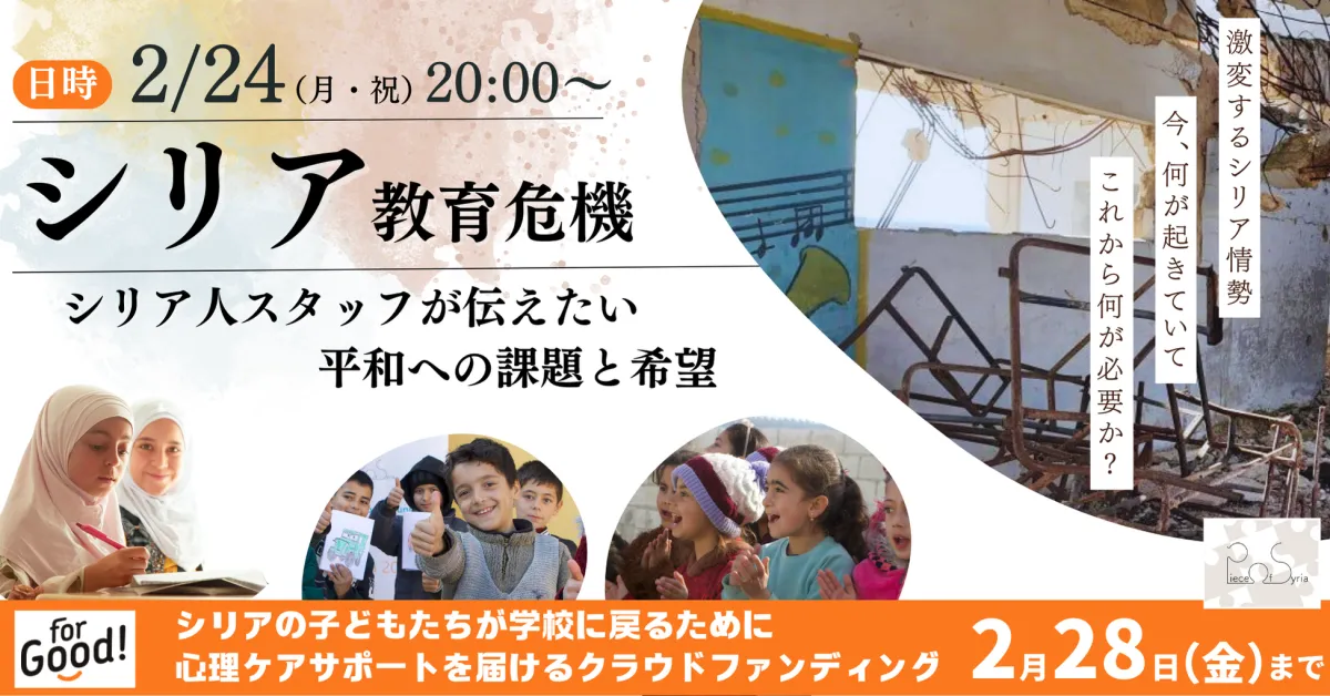 この度、Piece of Syriaは2025年2月24日にオンラインイベント「シリア教育危機〜シリア人スタッフが伝えたい平和への課題と希望〜」を開催します。シリアの現状や教育の課題について、実際に現地で活動しているシリア人スタッフからの報告を通じて、市民生活や教育の状況を深く理解することができる貴重な機会となります。イベントの詳細は、2月24日(月・祝)20:00から21:30まで行われ、参加希望者は事前にオンラインで申し込む必要があります。