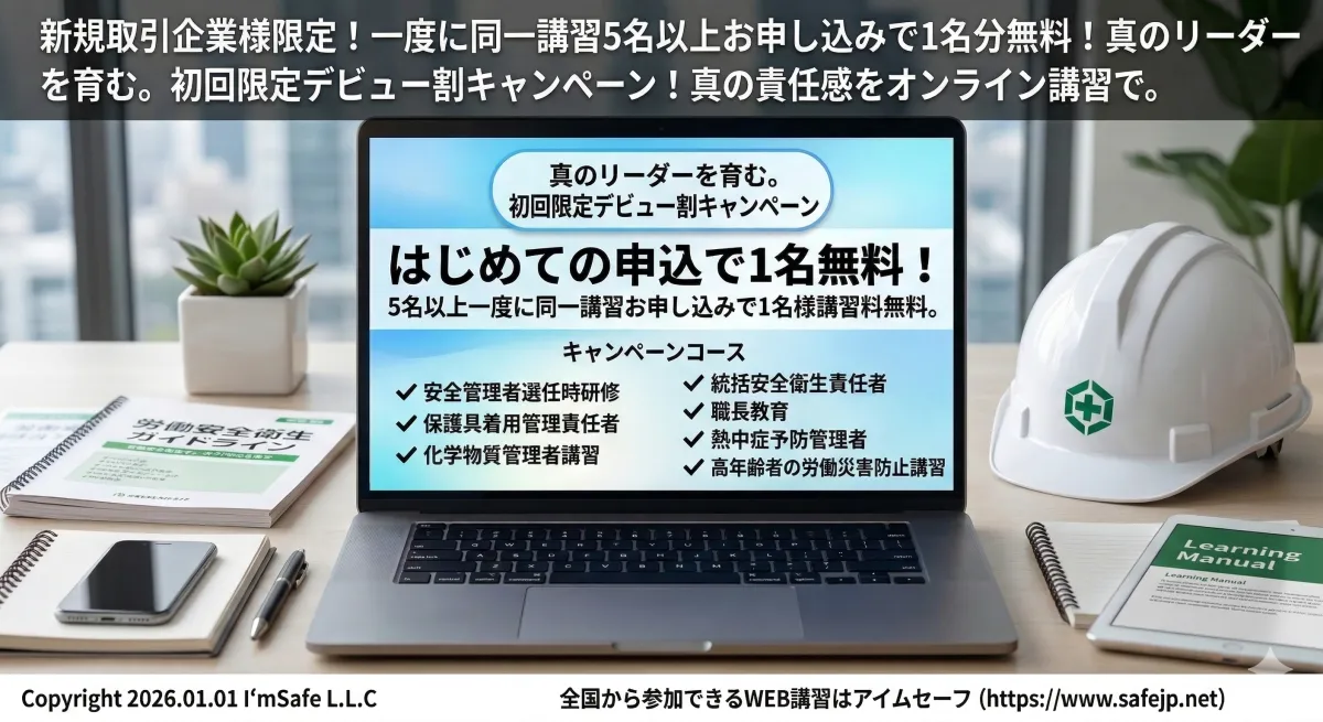 2026年4月、オンラインで提供される安全衛生教育の『アイムセーフ』が、新規企業向けの特別キャンペーンを開催します。このキャンペーンでは、初めて利用する企業の皆様に、5名以上の申し込みを行うと1名分の受講料が無料になる特典があります。これにより、労働安全衛生への取り組みをより身近なものにし、コスト削減にもつなげることが可能です。