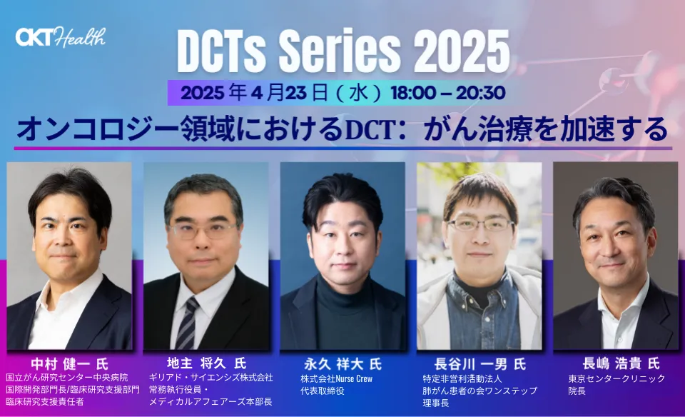 株式会社AKT Healthは、2024年11月からスタートする予定の分散型臨床試験(DCT)に関するシリーズイベントの第2弾を、2025年4月23日(水)に開催します。本イベントは「オンコロジー領域におけるDCT:がん治療を加速する」というテーマで、東京の日本橋にて18時から行われます。このイベントは、医療機関や研究機関、製薬企業、さらには患者会の代表者などが一堂に集まり、DCTの現状、課題、今後の展望について意見を交わす貴重な機会です。