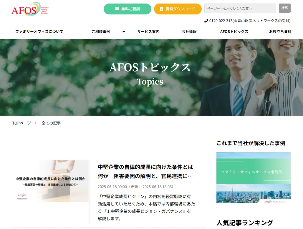 AFOSでは、この新コラムの他にも「中堅企業政策に見るファミリービジネスへの再評価」「中堅企業成長ビジョンのKGI・KPI」「ファミリーオフィスとは?」といったさまざまな関連コラムが公開されています。これらはファミリーオフィスやファミリービジネスに興味がある方々に特におすすめです。