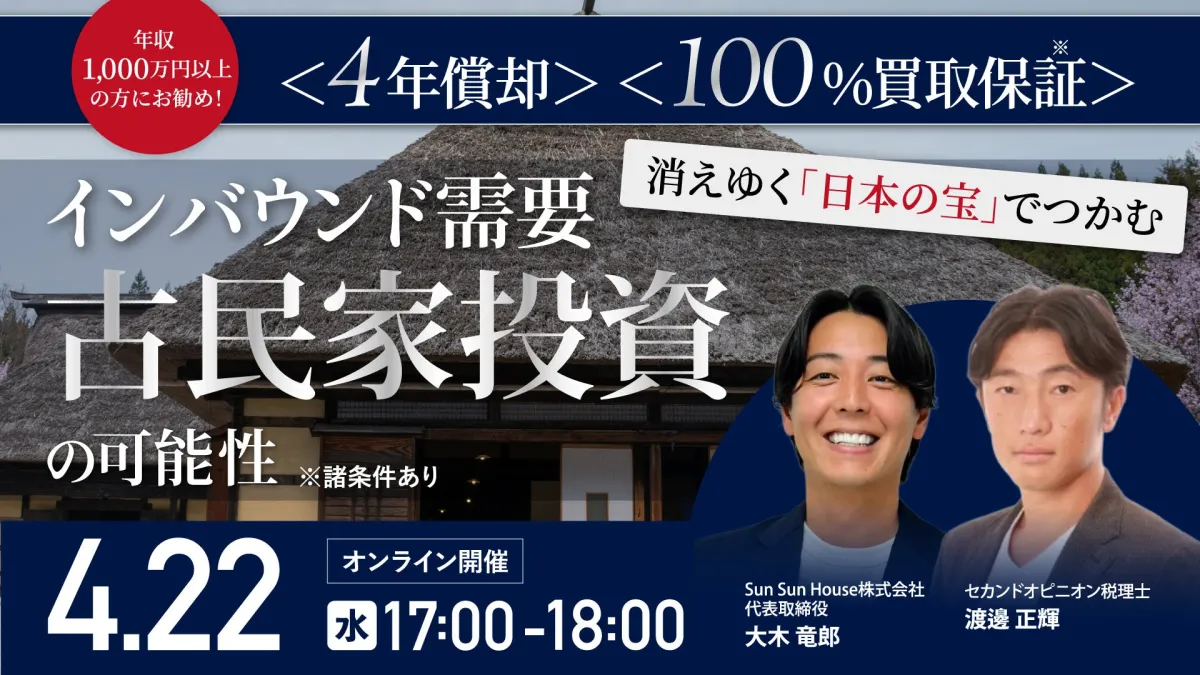 ウェビナーには、Sun Sun House株式会社の代表取締役である大木竜郎氏と、セカンドオピニオン税理士事務所の渡邊正輝氏が登壇します。二人はそれぞれに豊富な経験を持ち、特に古民家の価値を引き出す取り組みに深く関与しています。