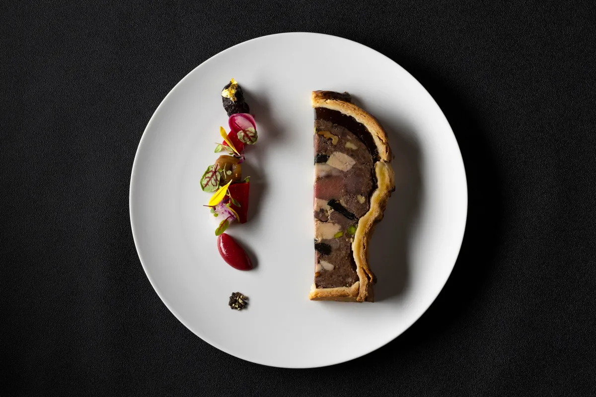 「王様のジビエ」とは、前菜の「パテ・ド・ロワ」とメインの「ジビエ・ア・ラ・ロワイヤル」から成る贅沢なコースです。前菜の「パテ・ド・ロワ」は、鹿や猪、山鳩など4種類以上のジビエを使い、トリュフやフォアグラを幾層にも重ねた上品なパイとして焼き上げられます。このパイは王冠の形をしており、切り分ける際には美しい断面が目を引きます。さらに、酸味のあるグロゼイユのソースや、甘みを感じる紅芯大根が添えられ、食感に変化を加えています。