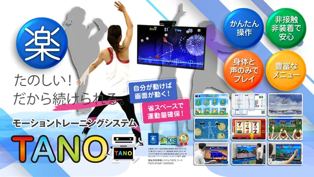 TANOは、センサーに誘導される形で体を動かすことで、様々な運動体験を提供する非接触型の運動支援ツールです。約300種類のコンテンツが搭載されており、体操や認知トレーニング、脳活性化プログラムなど、多様なメニューをゲーム感覚で楽しむことができます。高齢者から子どもまで、幅広い世代に対応しており、福祉施設や病院、教育機関など、様々な現場での導入が進んでいます。2023年度には、国立研究開発法人日本医療研究開発機構(AMED)の支援を受け、機能や操作の向上が図られました。利用者の自発的な参加を促し、介護スタッフの負担軽減にも寄与しています。