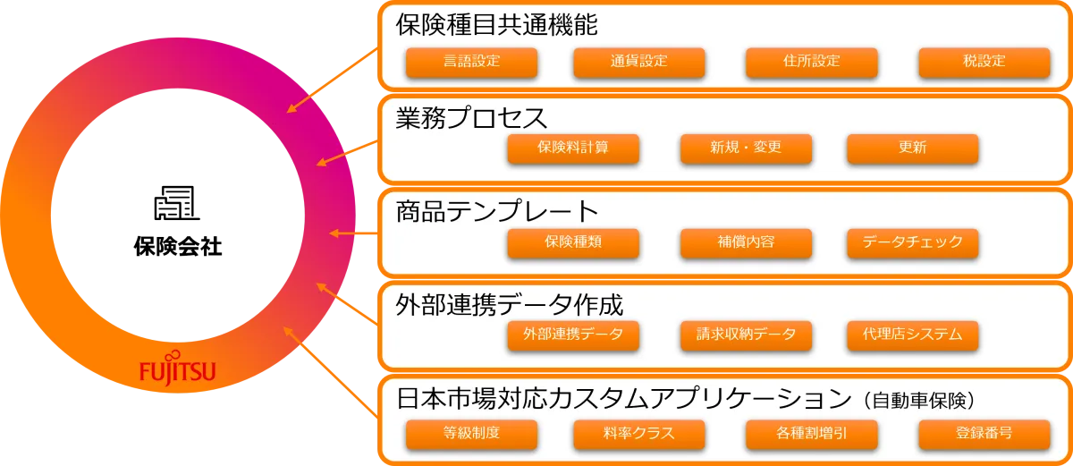 「Fujitsu Cloud for Insurance Japan Edition」は、SAP Fioneerの「SAP Fioneer Cloud for Insurance」を基に、日本特有の業務プロセスや法規制に対応した機能を独自に開発しています。第一弾として、自動車保険向けの機能を中心に提供スタートし、言語設定や共通機能を備えています。このプラットフォームは、保険会社や代理店が使いやすいフロント画面を提供し、外部データとの連携も強化。管理の一元化や業務プロセスの効率化を目指します。