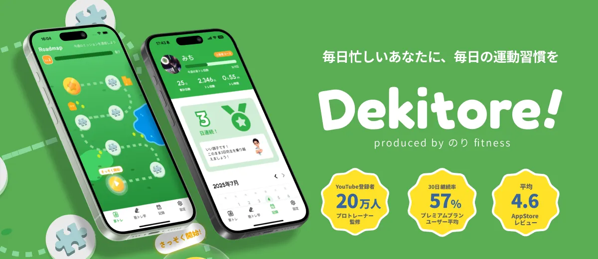「できトレ」は、ジムに行く時間がない、運動を続けることができない、周囲の目が気になるといった理由で運動を諦めていた方に向けた、新たな選択肢を提供します。自宅でのトレーニングをゲーム感覚で習慣化し、自由に自分らしく健康的な体を手に入れることができます。