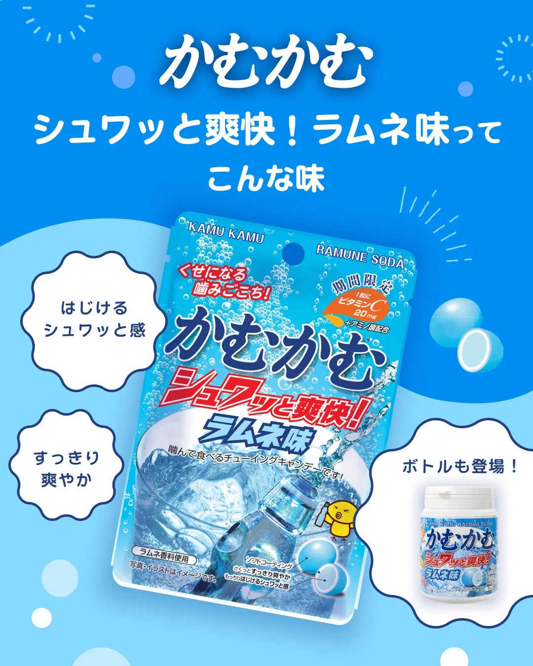 この春夏は、かむかむシュワッと爽快ラムネ味を手に入れて、爽やかな気持ちで過ごしましょう!