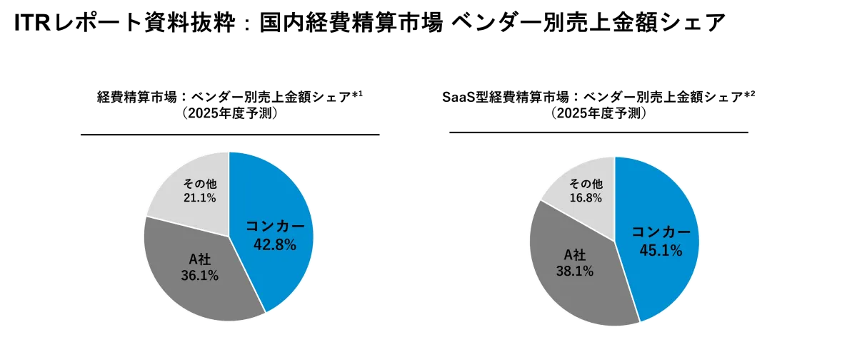 出張・経費管理のクラウドサービスを展開する株式会社コンカーが、国内経費精算市場での売上金額シェアにおいて、2014年度より12年連続でNo.1を達成しました。この実績は、ITRが発行した「ITR Market View:予算・経費・サブスクリプション管理市場2026」の市場調査レポートに基づいています。最新の調査によると、コンカーの2025年度の経費精算市場でのシェアは42.8%、SaaS型経費精算市場では45.1%を記録しています。