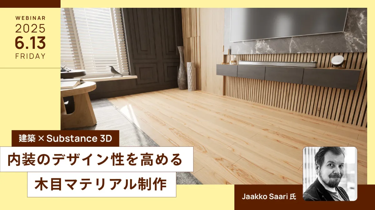 2025年6月13日(金)、株式会社ボーンデジタルが主催するオンラインセミナー、「建築×Substance 3D 内装のデザイン性を高める木目マテリアル制作」が開催されます。このセミナーは、建築ビジュアライゼーション分野におけるフォトリアルなPBR(Physically Based Rendering)マテリアル制作をテーマにしています。