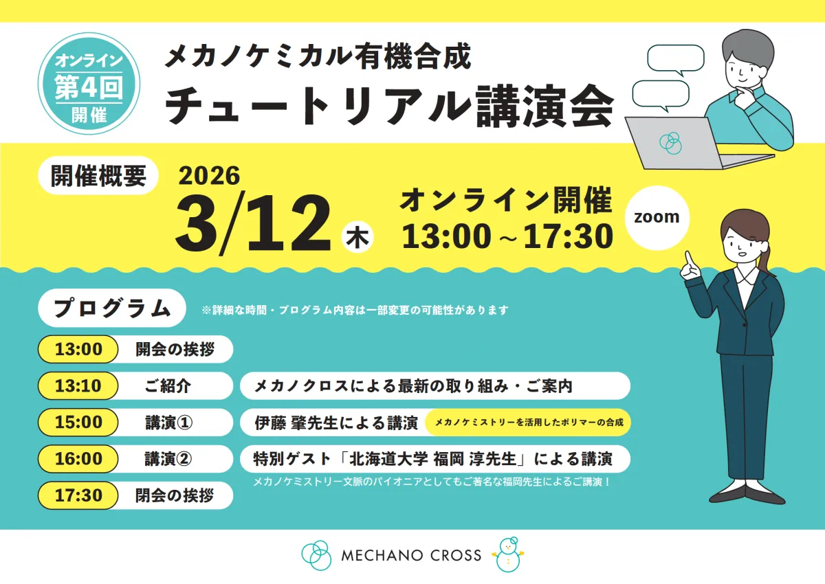 株式会社メカノクロスが主催する「第4回メカノケミカル有機合成チュートリアル」講演会が、2026年3月12日(木)にオンラインで開催されることが決定しました。この講演会では、特別ゲストとして北海道大学の福岡淳教授が招かれ、最新の研究動向や今後の展望についてお話しいただく予定です。