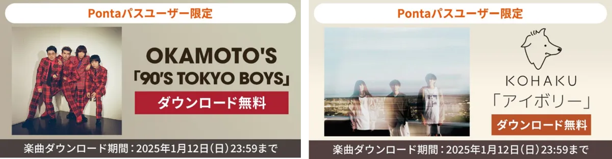 デジタル音楽の楽しみを広げるPontaパスが、2024年12月13日から2025年1月12日までの約1ヶ月間、会員限定でOKAMOTO'Sの「90'S TOKYO BOYS」とKOHAKUの「アイボリー」を無料でダウンロードできる特典を提供します。このキャンペーンは、「今、注目しておきたいアーティスト」をテーマにしており、新豚パス会員にとって見逃せないイベントです。