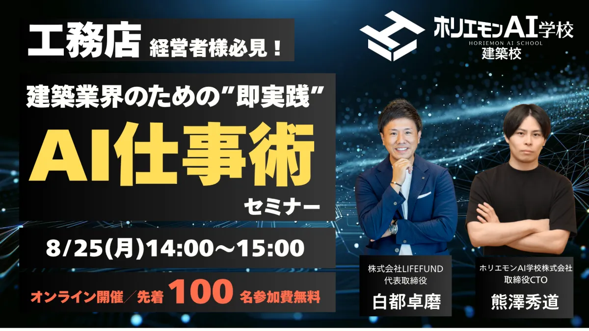2025年8月25日、株式会社LIFEFUNDがホリエモンAI学校建築校と共に無料オンラインセミナーを開催します。このセミナーは、特に工務店の経営者や建築業界の事業者に向けて、AI技術を活用した実践的な働き方を提案するものです。セミナーの詳細は、こちらの特設ページからご確認いただけます。