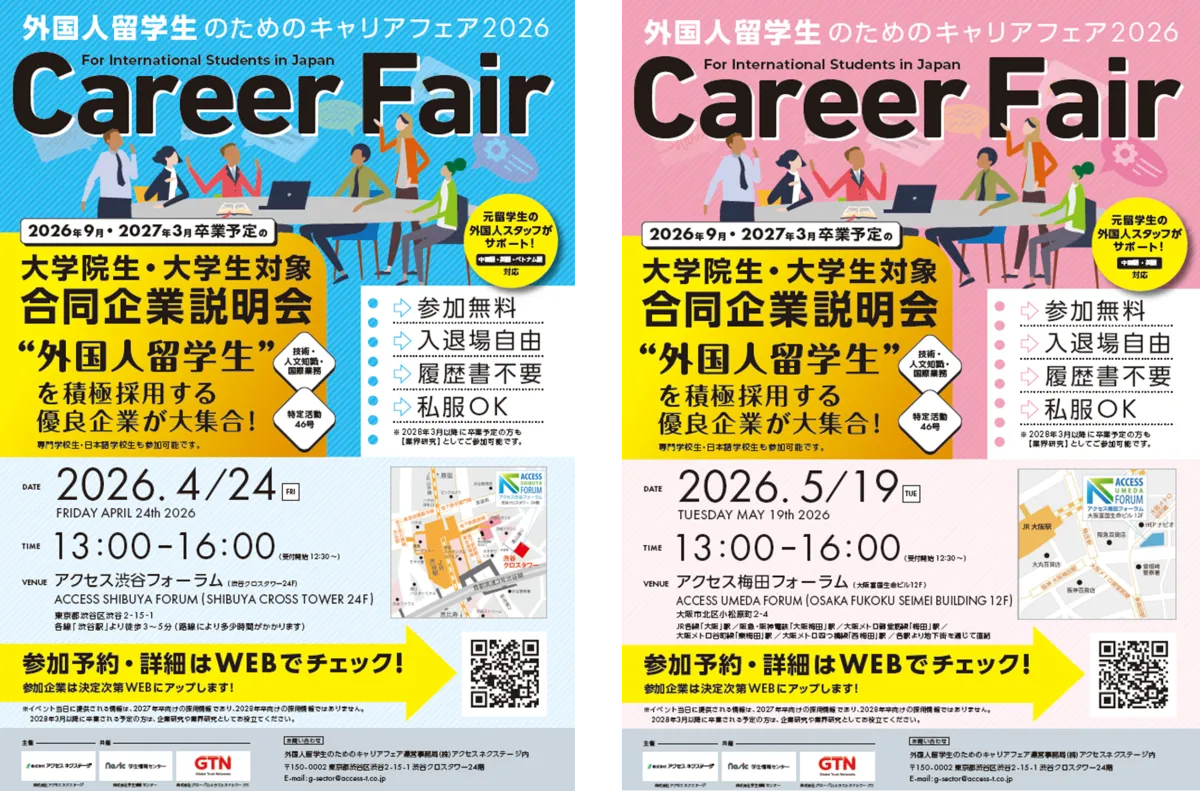 外国人留学生の就職活動を支援する「外国人留学生のためのキャリアフェア2026」が、2026年4月24日(金)東京、5月19日(火)大阪にて開催されます。このイベントは、株式会社アクセスグループ・ホールディングスの子会社である株式会社アクセスネクステージが、株式会社学生情報センターおよび株式会社グローバルトラストネットワークスと共催します。