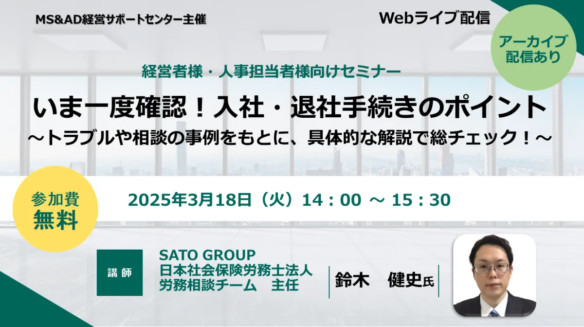 3月18日(火)に、三井住友海上火災保険株式会社が主催するオンラインセミナーが開催されます。このセミナーでは、企業の人事労務担当者を対象に入社・退社手続きのポイントを徹底的に解説します。特にこの時期は、従業員の入社や退社が増えるため、トラブルを未然に防ぐための知識が求められています。