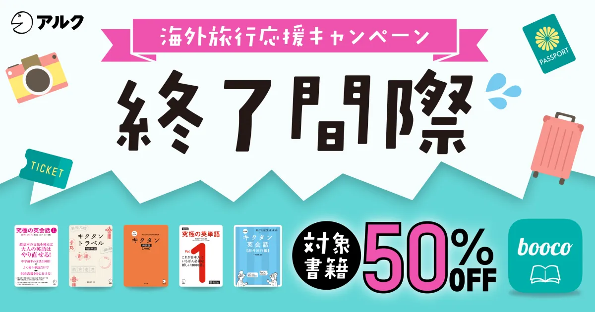 株式会社アルクが提供する学習アプリ「booco(ブーコ)」での特別な「海外旅行英会話キャンペーン」が、2025年9月18日(木)14時に終了します。このキャンペーンでは、旅行で使える英語、韓国語、台湾華語の人気書籍が通常価格の50%オフで手に入ります。残りわずかなこの機会をぜひお見逃しなく!