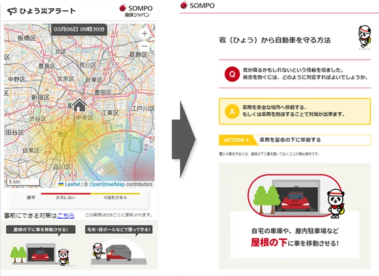 このサービスの大きな目的は、これまでの保険が事故後の経済的補填だけでなく、実際に事故を未然に防ぐことで、お客様に新たな「安心」を提供することです。具体的には、雹が降るリスクがあるとされる地域やタイミングに応じて、アラートを送信し、利用者に適切な行動を促します。