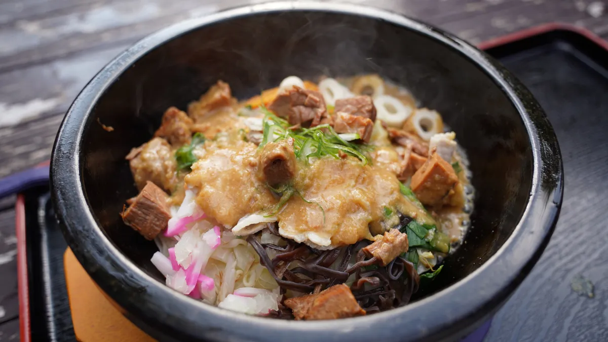 地獄蒸し仕上げ:麺と旬の野菜は、別府の地熱を最大限に生かし、地獄蒸しで調理されています。