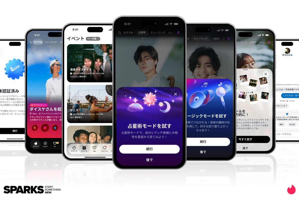 Tinderは、10年以上にわたってデーティングの方法を革新し続けてきました。今回の発表により、ユーザーは新たなソーシャル体験を享受できるようになります。それにより、マッチが実際の会話に発展する可能性を高め、より多くの「Sparks」を生むことを目指しています。