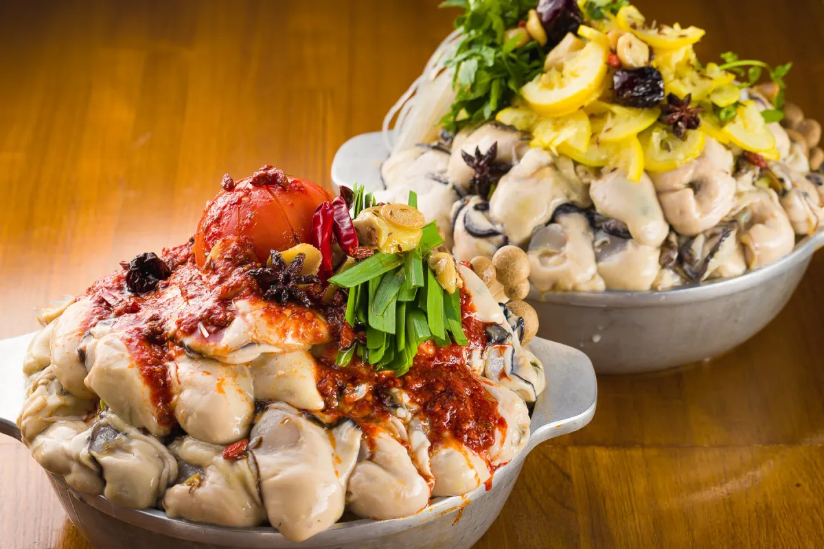 「牡蠣麻辣湯」をたくさん味わいたい方には、お得なコースも用意されています。このコースでは、当日の新鮮な生牡蠣の食べ比べや、特製カキフライ、さらには「薬膳牡蠣火鍋 赤 or 白」を楽しむことができます。7品からなるフルコースが、一人あたり5,400円で提供され、料理はもちろん飲み放題オプションも選べるため、友人との集まりやビジネスの会食にもぴったりです。
