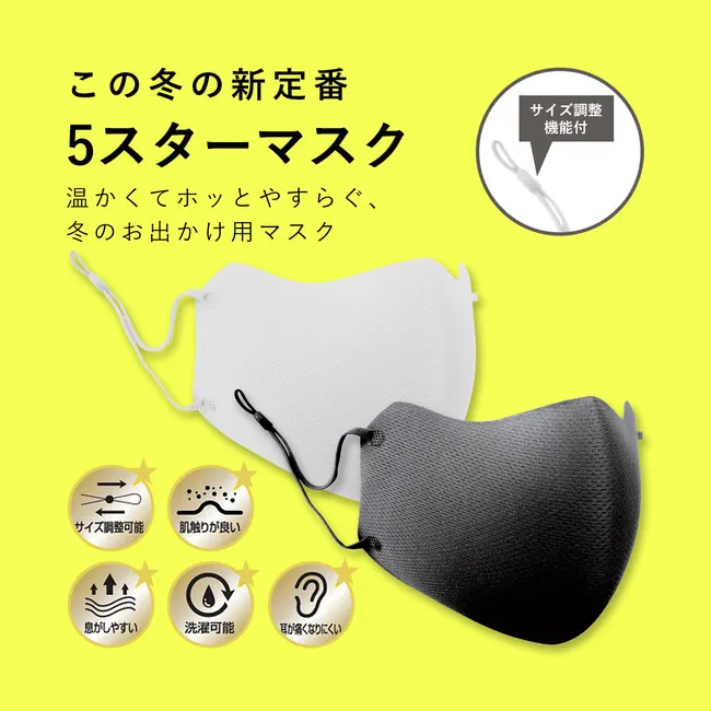 「5スターマスク」は、口とマスクの間に空間を設けるユニークな設計が特徴です。この設計により、長時間の着用でも息苦しさを感じず、快適な呼吸を実現しています。さらに、ふんわりとした厚手の生地を使用しているため、肌に優しく、寒い季節には防寒対策としても優れた効果を発揮します。