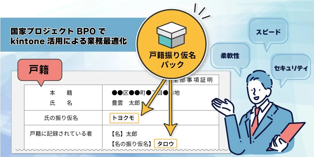 NTTネクシアは、戸籍法改正に伴うBPO業務を担い、トヨクモクラウドコネクト株式会社(TCC)が提供する「戸籍振り仮名パック」を使用して、kintoneを基にした新たな業務環境を素早く構築しました。このプロジェクトは、全国の自治体での緊急課題に対処するもので、特に短期間でのシステム構築が求められました。
