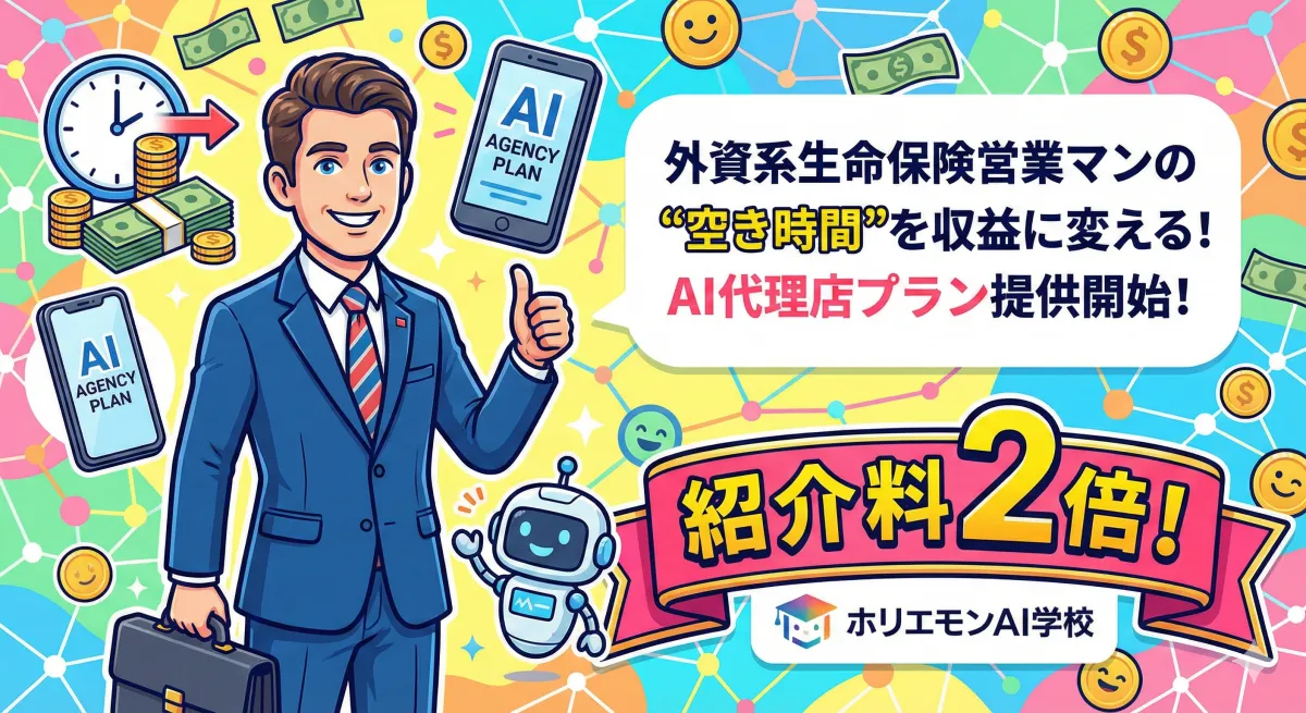 ホリエモンAI学校株式会社は、外資系生命保険営業マン向けに、新たに収益化のプランを提供開始しました。このプランでは、営業マンの“空き時間”を有効利用させることに焦点を当てています。実施中の紹介パートナープログラムにおいて、紹介料を従来の10%から期間限定で20%に増額し、営業マンを支援。