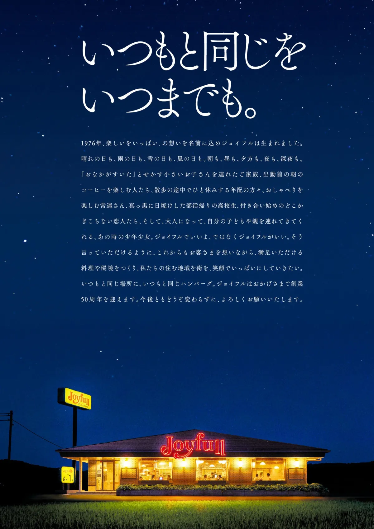 会社が50周年を迎えるにあたり、「いつもと同じをいつまでも」とのビジュアルメッセージを発表しました。夜空に輝くジョイフル店舗の画像が強調され、昔ながらのネオンのロゴが特徴的で、50年前から変わらぬ地域住民への感謝の気持ちが込められています。