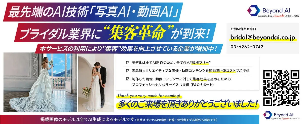 多くの貴重なご意見やニーズを収集できたことを機に、Beyond AIはAIモデルやAI広告写真のさらなる発展を目指します。私たちは、「人とAIで創る豊かな世界へ」という理念のもと、ブライダルに関わる全ての人々がより良い時間と価値を感じられる未来を築くために、努力を続けていきます。