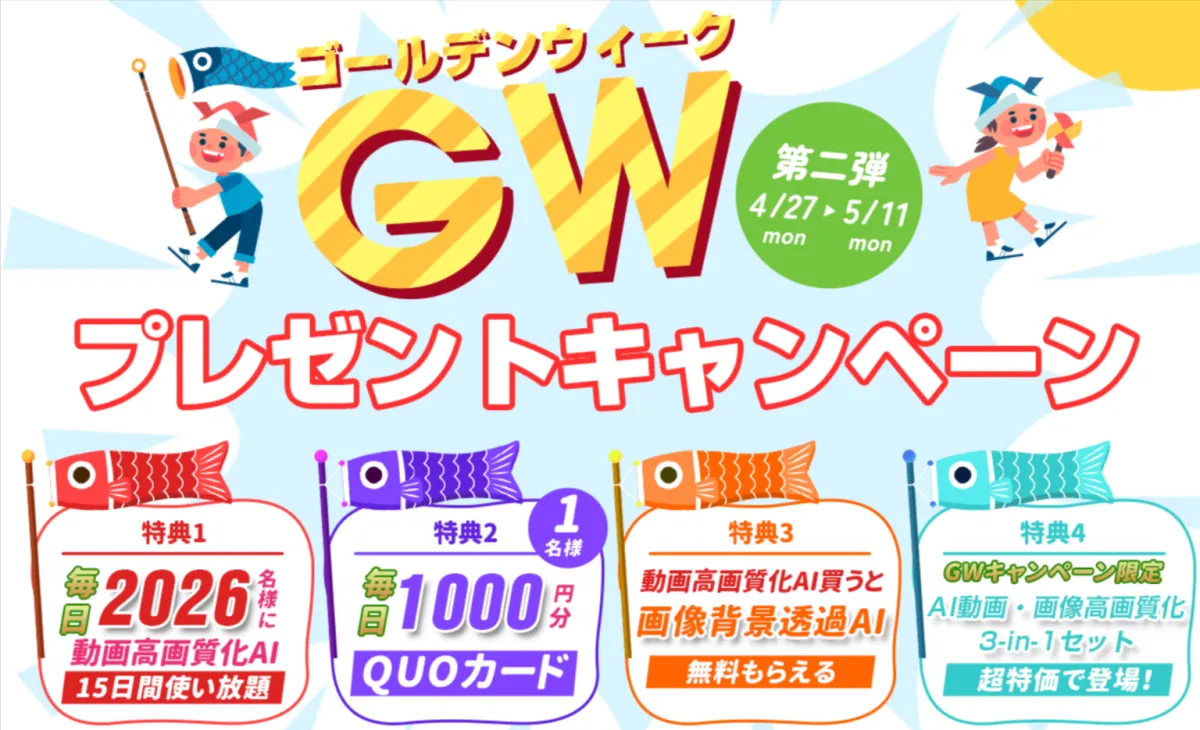 Digiarty Software, Inc.が2026年のゴールデンウィークに向けて、特別キャンペーンを実施中です。「Aiarty Video Enhancer」「Winxvideo AI」「VideoProc Converter AI」という人気製品のライセンスコードを毎日2026名様に無料でプレゼント!さらに、QUOカード1000円分も毎日1名様に当たる抽選で提供しています。