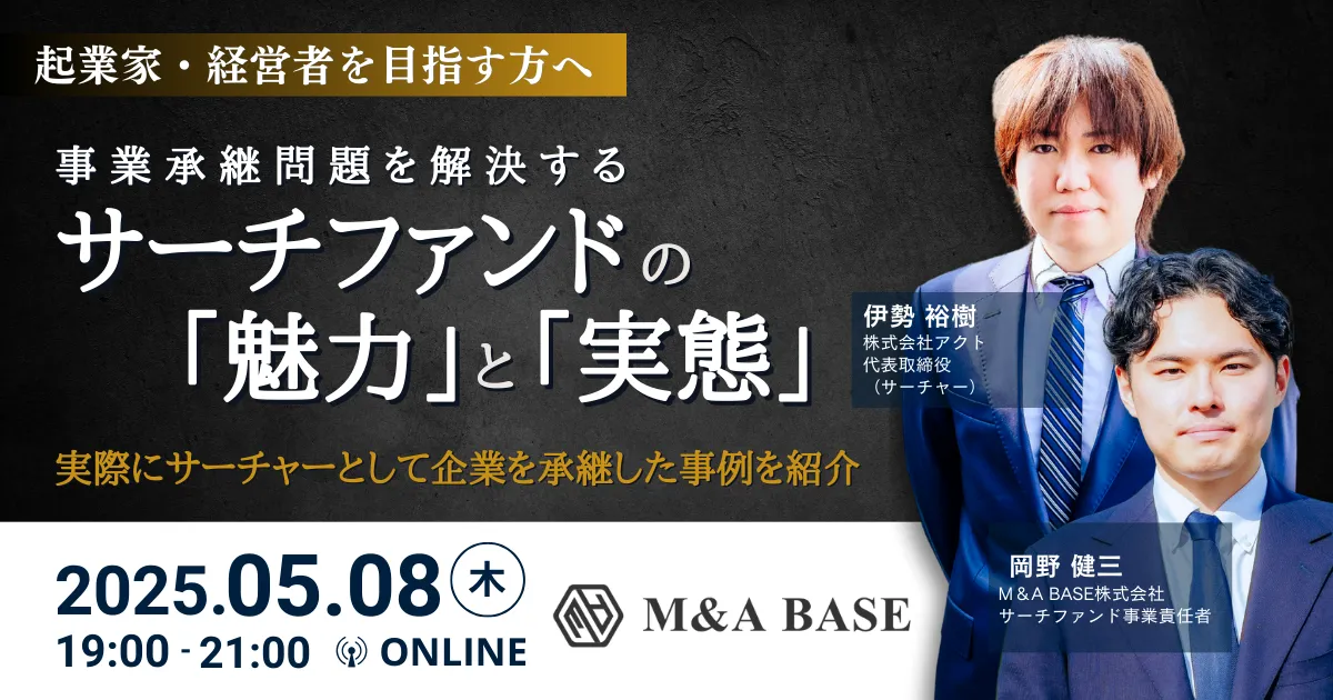 中小企業の事業承継問題はますます深刻化している現代において、注目を集めるようになった新しい形の事業承継モデル「サーチファンド」に関するウェビナーが、M&A BASE株式会社により開催されます。2025年5月8日(木)19:00より、オンラインで行われる予定です。このウェビナーでは、サーチファンドの仕組みやその実際の運用ケースについて詳しく紹介される機会となります。