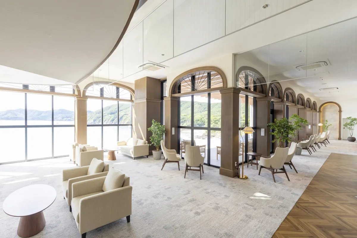 TAOYA南志摩の魅力の一つは、開放的なオーシャンラウンジです。ここでは水盤や重厚な家具が設けられ、まるで海外リゾートにいるかのような雰囲気。心地よい波音や海風を感じながら、暖炉ラウンジでリラックスすることもできます。ドリンクを片手に、目の前に広がる美しい景色を眺めながら、特別な時間を楽しんでください。