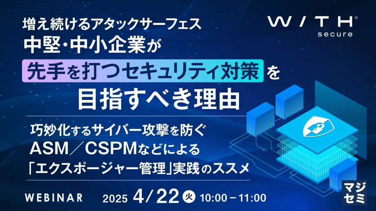 現代のIT環境では、サイバー攻撃の手法が年々巧妙化し、企業は自らの資産を守るための対策が求められています。特に中堅・中小企業においては、限られたリソースやスキルの中で、効果的なセキュリティ対策を講じることが難しいのが現状です。そんな中、ウィズセキュア株式会社が開催するウェビナーでは、「先手を打つセキュリティ対策」をテーマとし、中堅・中小企業を対象に具体的な対策を紹介します。