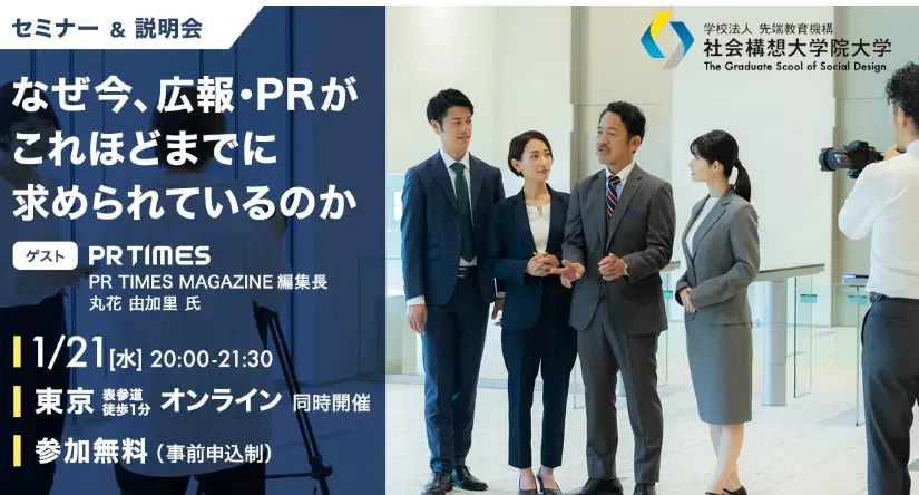 2026年1月21日(水)、学校法人先端教育機構 社会構想大学院大学にて「なぜ今、広報・PRがこれほどまでに求められているのか」というセミナーが開催されます。本イベントでは、広報・PRの意義や経営における重要性について、専門家の丸花由加里氏をお招きして解説していただきます。