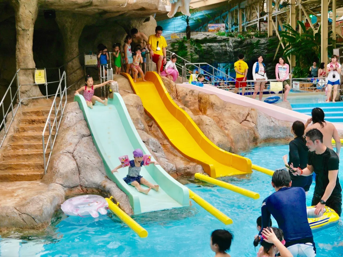 もふもふの椰子の木に囲まれた大ドーム「ウォーターパーク」は、雨天でも安心して遊べる全天候型の施設です。夏の暑さを忘れさせるような、温泉を利用したプールでリラックスし、楽しい時間を過ごすことができます。