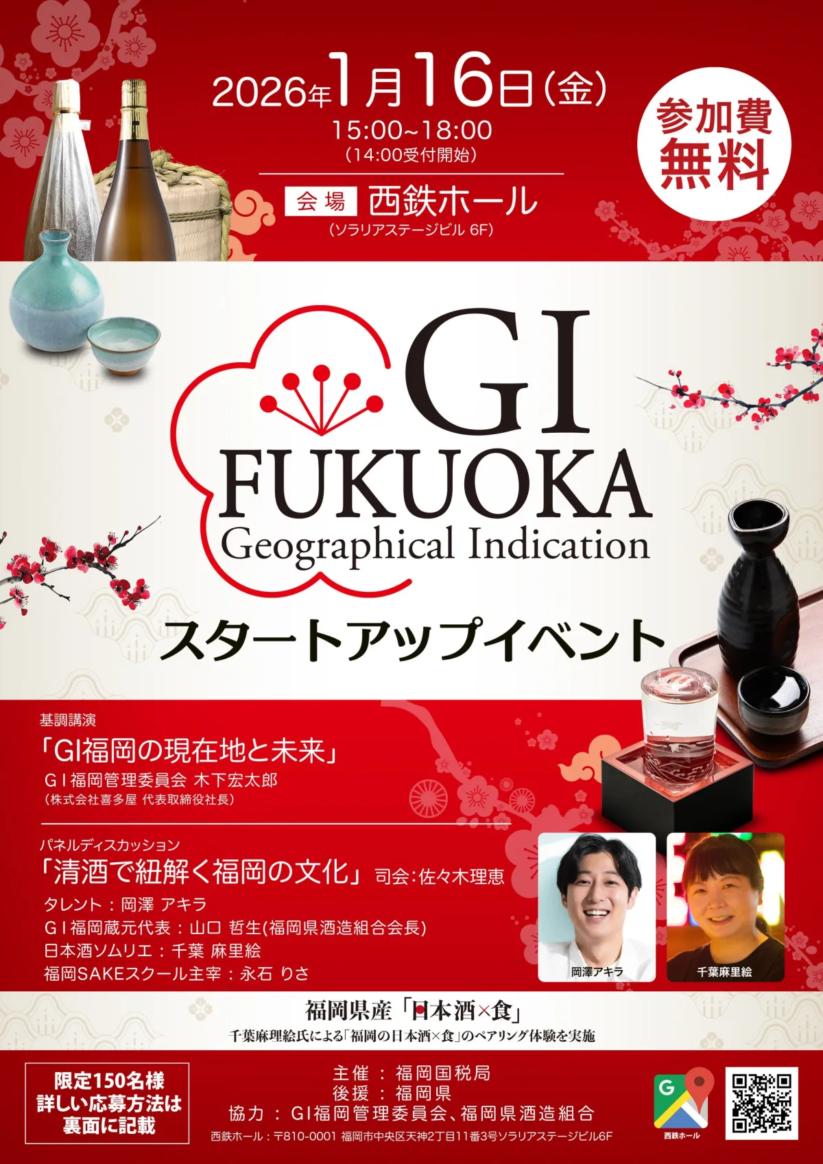 GI指定を受けたことを記念し、2026年1月16日(金)に『GI福岡スタートアップイベント』が開催されます。このイベントでは、日本酒の魅力をさらに広げるために、講演やパネルディスカッション、フードペアリング体験など多彩なプログラムが用意されています。