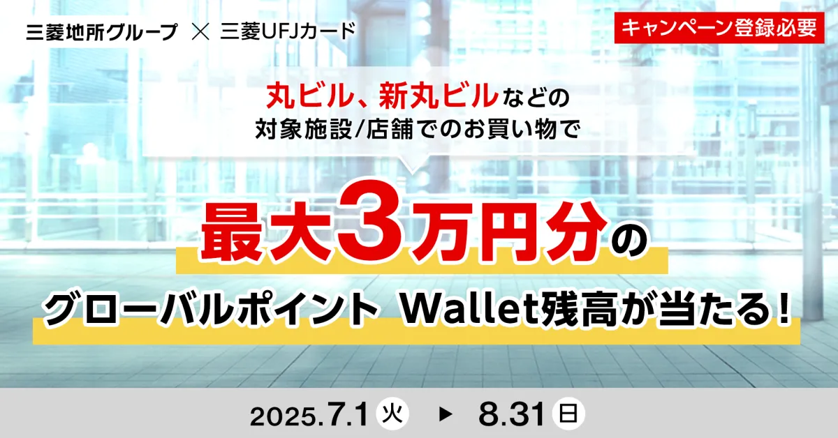 三菱UFJニコスは、2025年7月1日より8月31日までの期間、個人会員を対象にした魅力的なキャンペーンを開始します。このキャンペーンでは、三菱地所が管理する丸の内、大手町、有楽町の26施設で「三菱UFJカード」を使って5,000円以上の購入を行うと、抽選で最大3万円分の「グローバルポイント Wallet」の残高が獲得できるチャンスがあります。