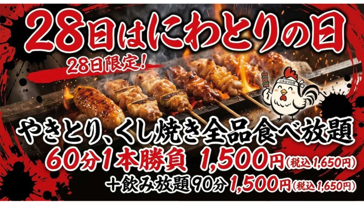 2026年4月28日(火)に、東京の堀切菖蒲園店と大阪の金剛駅前店で特別なイベント「にわとりの日」が開催されます。この日は、八剣伝の名物やきとりが食べ放題で楽しめる一日限定のチャンスです。料金はわずか1,500円(税別1,650円)で、60分間やきとり・くし焼きが好きなだけ楽しめるという嬉しい内容。