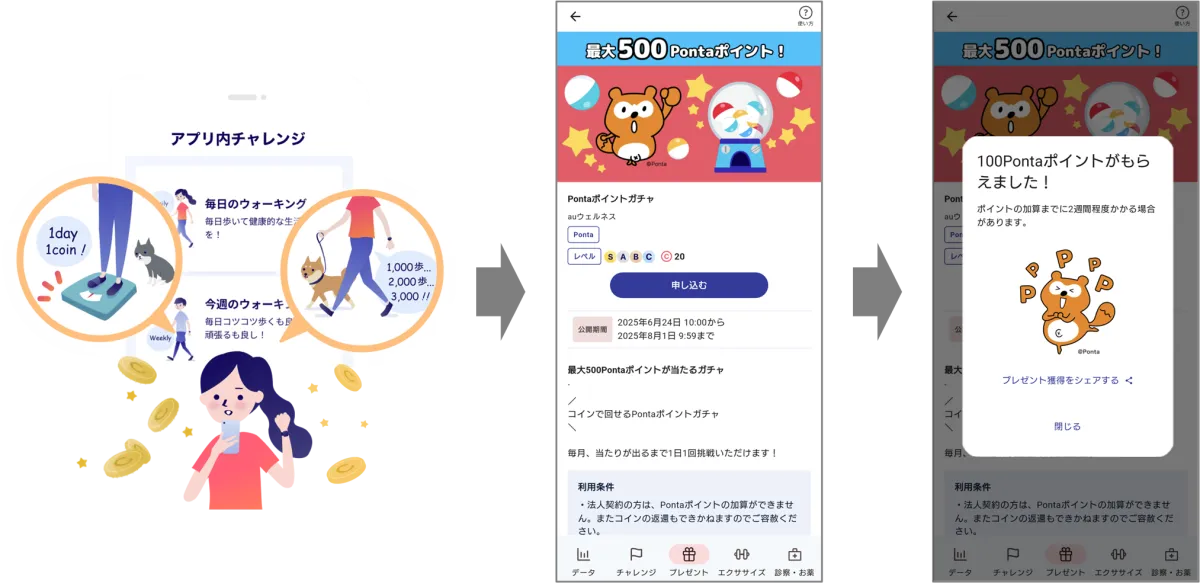 KDDIが提供するトータルヘルスケアアプリ「auウェルネス」が、2025年7月2日から新たに「Pontaポイントガチャ」を追加することを発表しました。この新機能は、健康活動を通じて貯めたコインを利用し、最大500Pontaポイントが当たるチャンスを提供します。