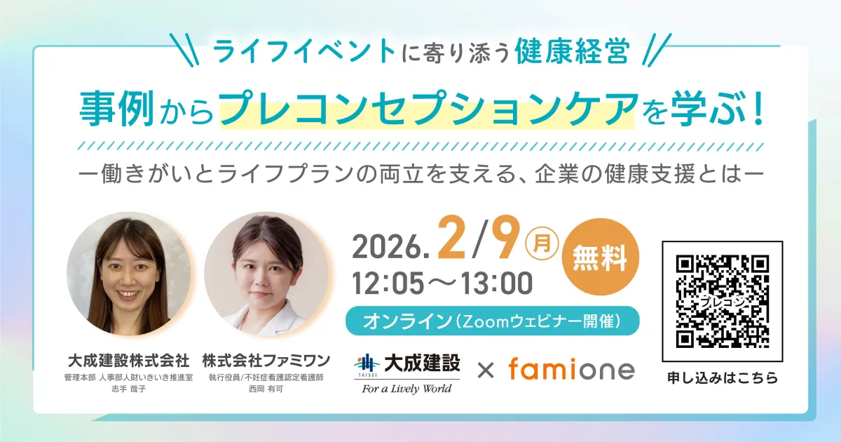 株式会社ファミワンが2月9日(月)に、企業向けの無料オンラインセミナー「ライフイベントに寄り添う健康経営事例からプレコンセプションケアを学ぶ!」を開催することを発表しました。このセミナーは、今注目されているプレコンセプションケアについての理解を深めることを目的とした内容です。