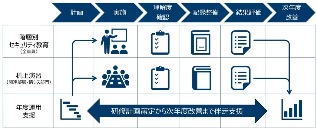 このような背景の中、DNPは全職員を対象にした階層別教育を提供しており、その実績を基に新たな研修プログラムを展開します。研修だけでなく、受講状況の把握、訓練結果の整理、監査を行うための記録整備までを一貫してサポートします。