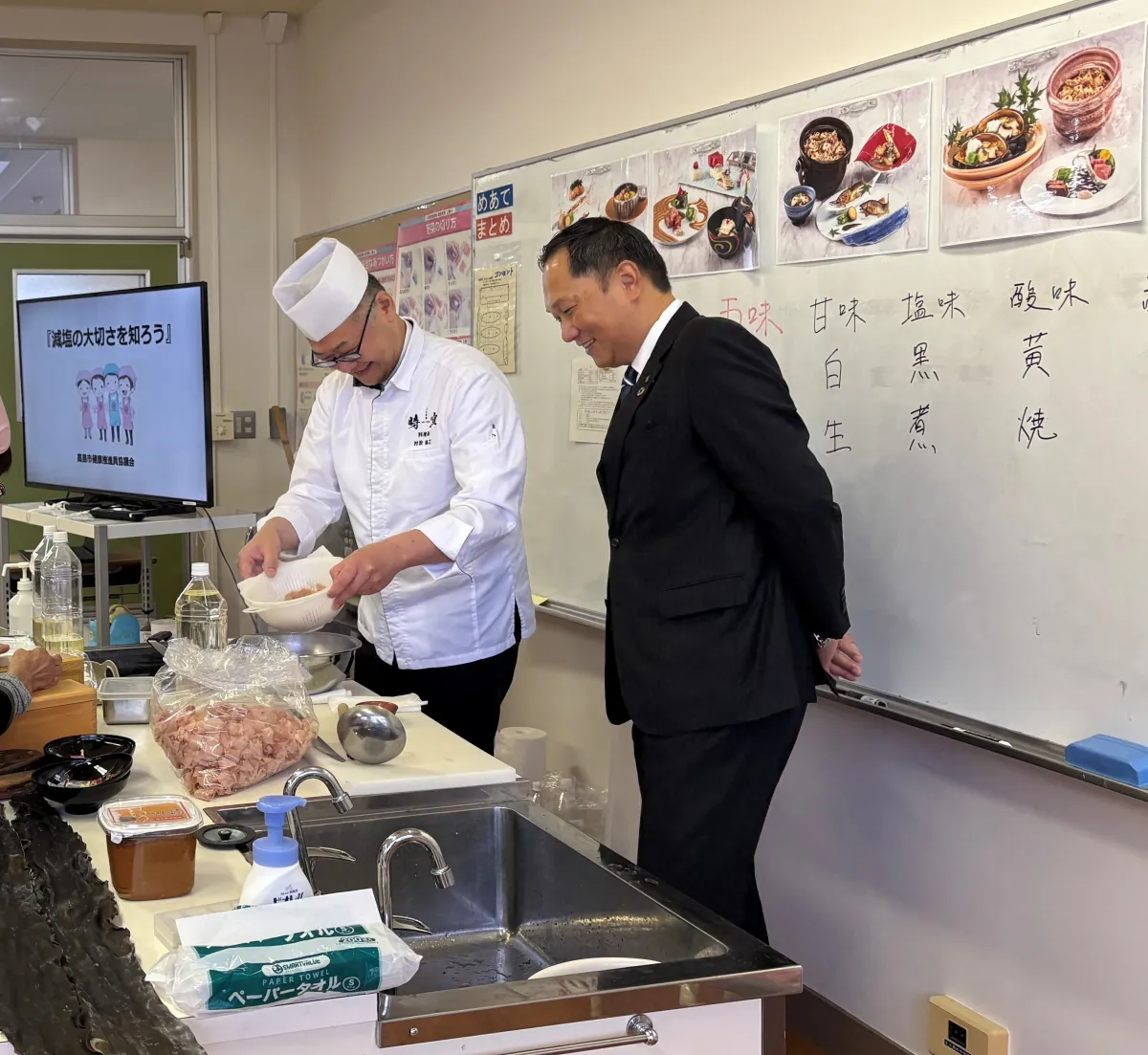 この減塩教室では、料理長の村松をはじめ、健康推進員たちが訪れ、5・6年生の子どもたちと一緒に「具だくさんみそ汁」を作る実習を行いました。実際にかつお節を削ったり、出汁を取ったり、野菜を切ったりすることで、子どもたちが食材と直接触れ合い、料理の過程を楽しむ貴重な体験となりました。参加した子どもたちは「出汁だけでも美味しかった」「味が薄くても美味しかった」との感想を述べ、素材の味を活かした食事の重要性を実感しました。
