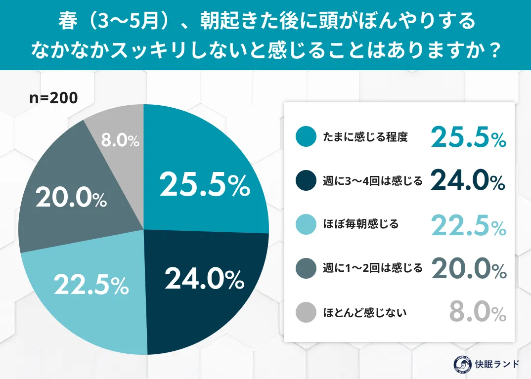 調査の結果、春に"頭がぼんやりする"と感じるのは多くの人が共通しているようです。具体的には、たまに感じる程度が25.5%、週に3〜4回は感じるという人が24.0%、さらにはほぼ毎朝感じるという層も22.5%に達し、この数字は春独特の経験であることがうかがえます。