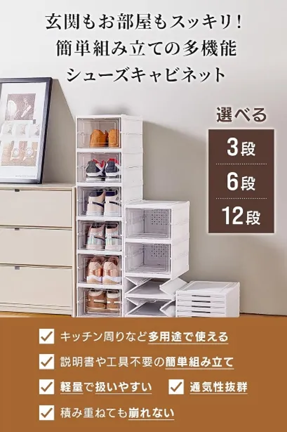 この多層シューズボックスは、価格が4,200円で、6段タイプの他にも3段や12段のバリエーションが存在します。カラーはクリア、クリアグレー、ホワイトが揃っており、部屋のインテリアや好みに合わせた選択が可能です。