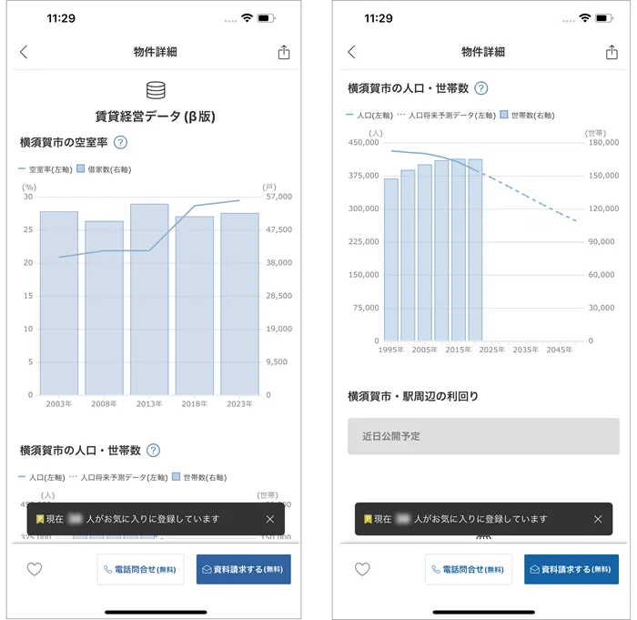 現時点では「賃貸経営データ」内に、「空室率」と「人口・世帯数」の情報を表示していますが、今後夏には市町村別の「平均利回り」の推移も新たに提供する予定です。これにより、投資判断に更なる洞察を加えることが期待されます。