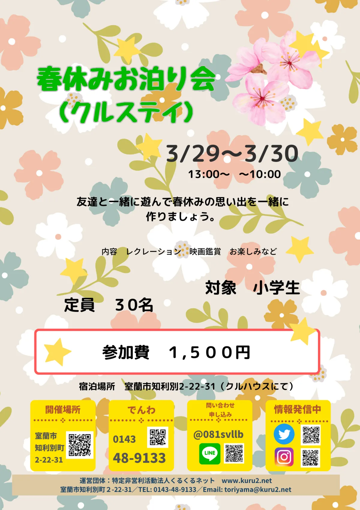 春休みがやってきます!このたび、特定非営利活動法人くるくるネットが主催する特別企画として、小学生を対象にした「春休みお泊り会(クルスティ)」を開催いたします。日程は2025年3月29日から30日までの約1日間、場も室蘭市知利別町の「クルハウス」で行われます。