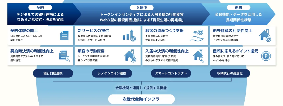 今回の実証実験では、シノケングループが行う賃貸管理における月次賃料の支払いにトークン化預金を適用し、その結果を2025年12月までに検証します。この成果を受けて、2026年以降の本格導入へと進む予定です。