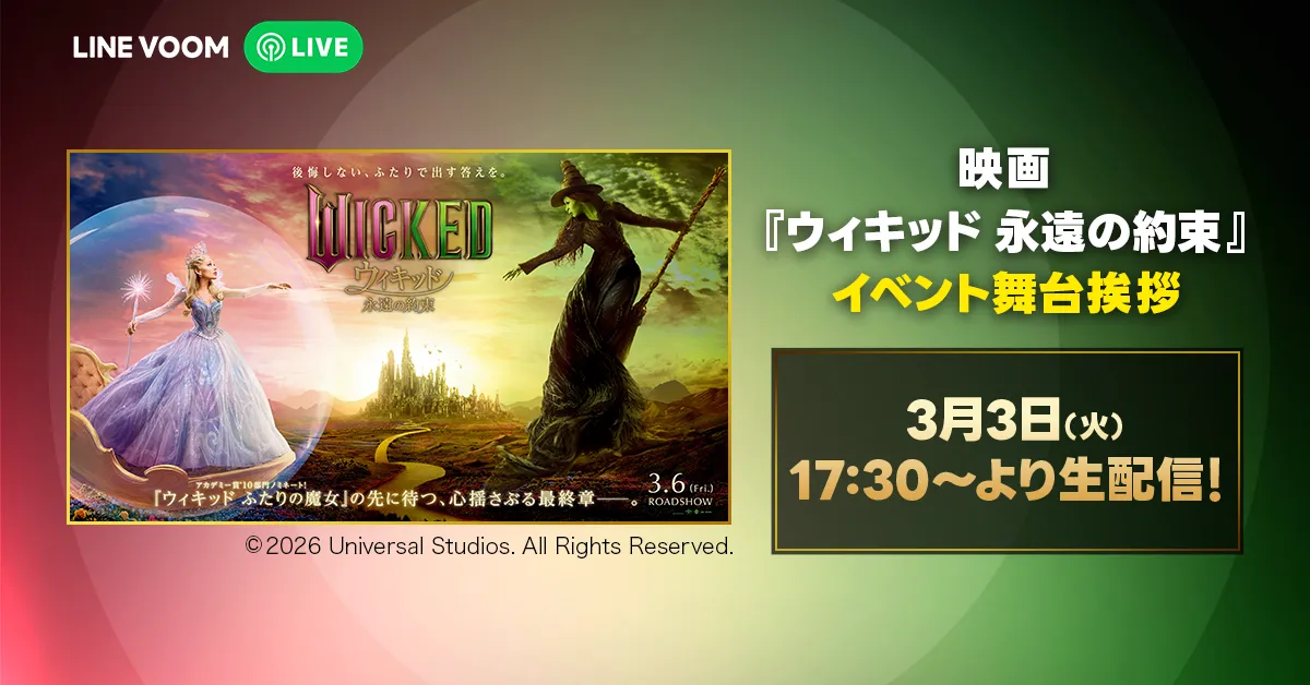 2026年3月3日(火)、映画『ウィキッド 永遠の約束』(原題:Wicked: For Good)の日本語吹替版最速上映イベントが行われます。この注目のイベントは、LINEヤフー株式会社が提供する「LINE」アプリ内のショート動画プラットフォーム「LINE VOOM」で独占ライブ配信されることが決定しました。